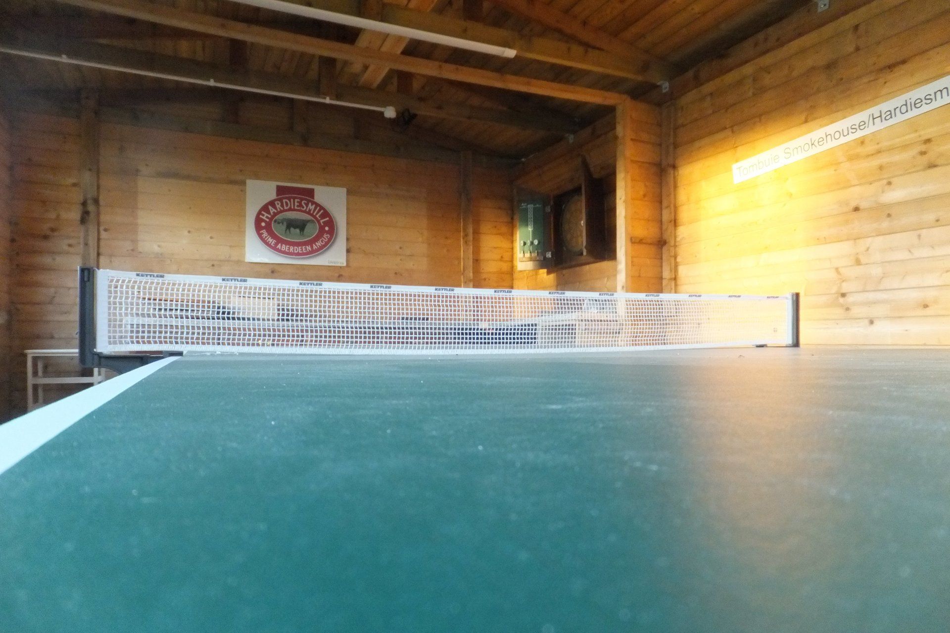A garage converted into a wet weather play area, with full-size table tennis and a dart board.